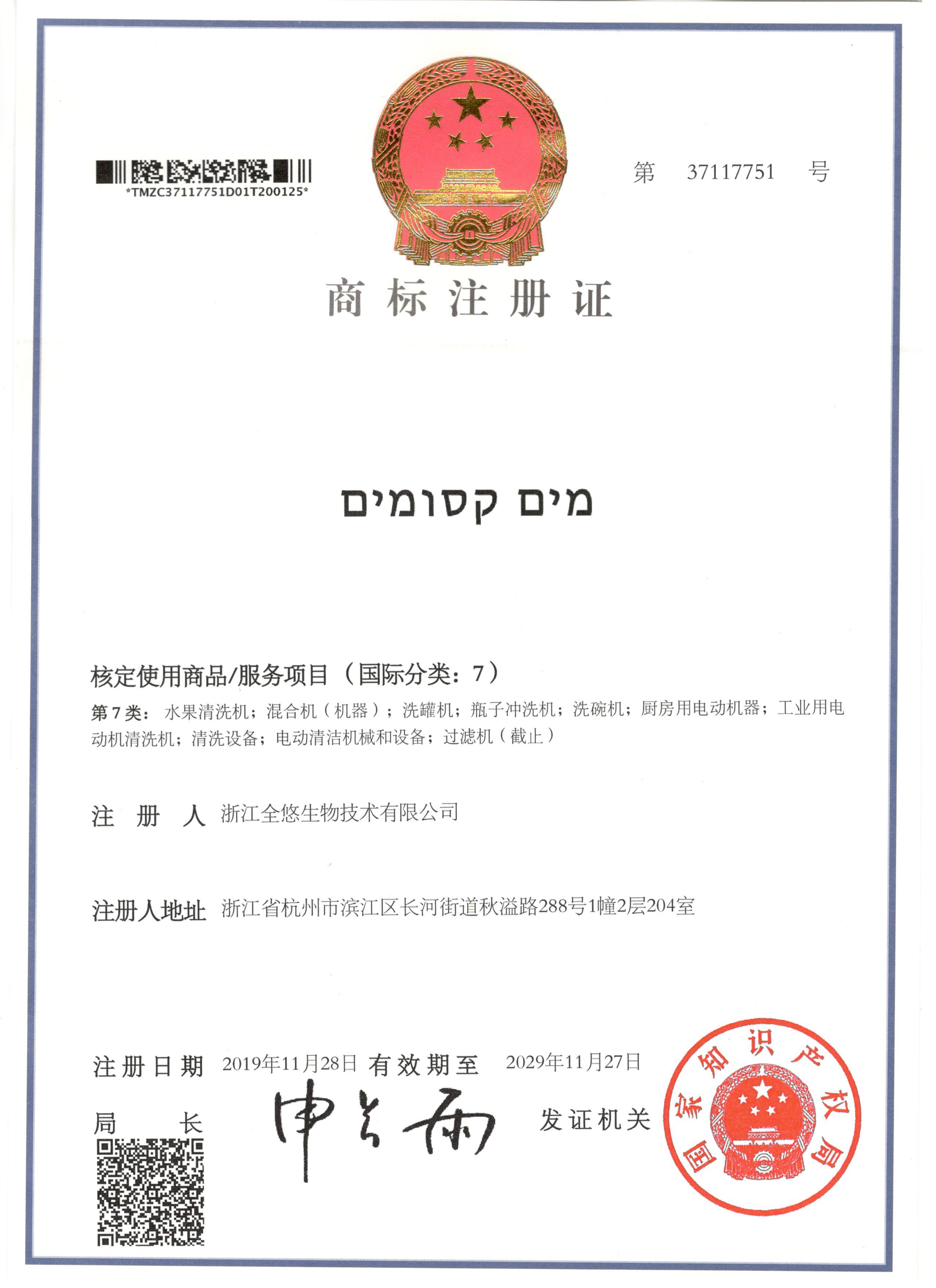 商标证书-希伯来语