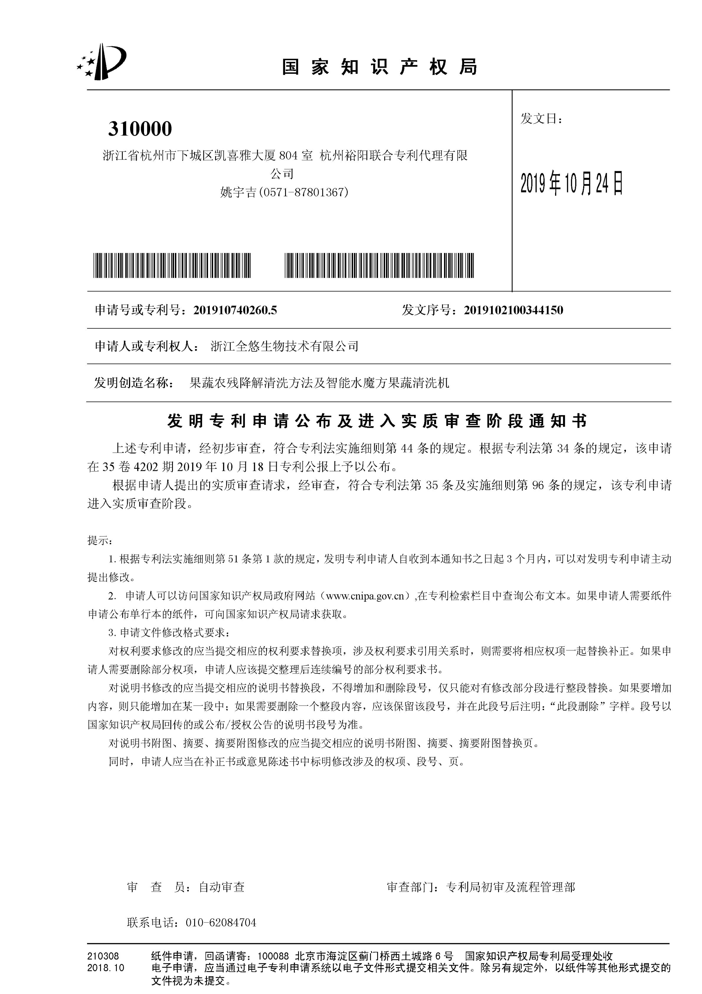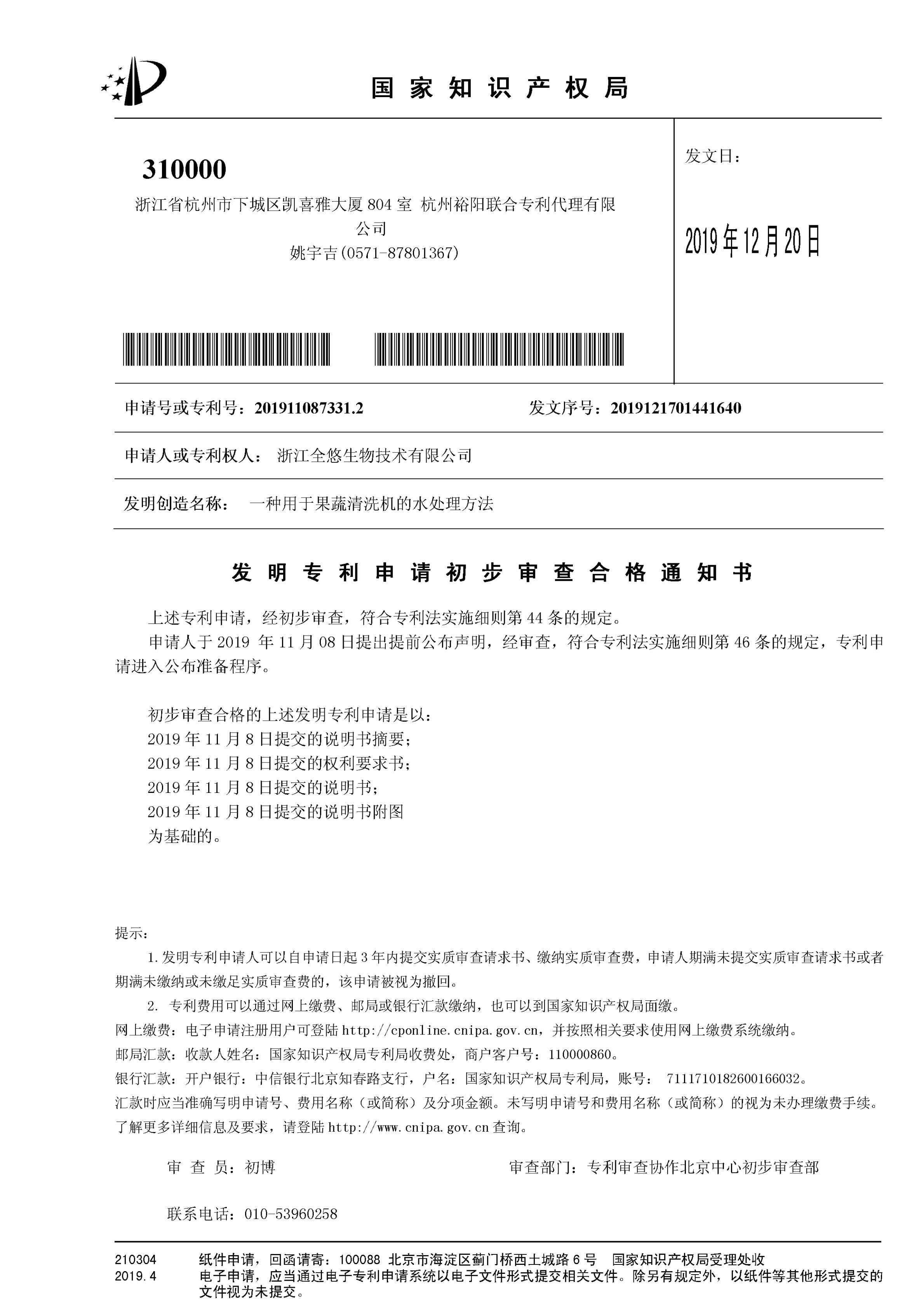 发明专利申请初步审查合格通知书